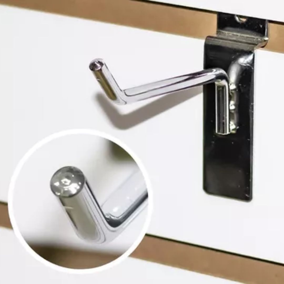 La ganchera metálica cromada espiga 15 cm es un accesorio de exhibición para panel ranurado, diseñado para uso comercial en retail.